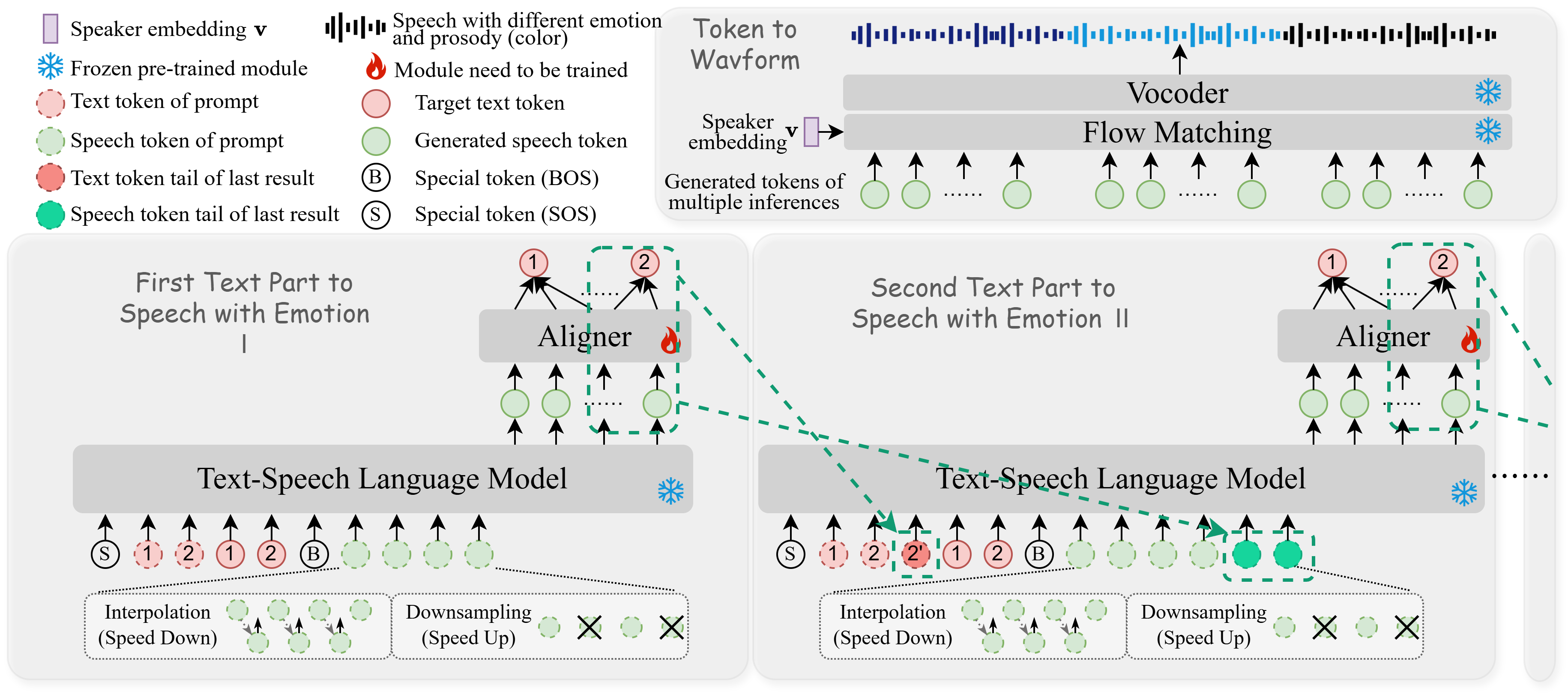 Figure 2. Word-level emotion and speaking rate control using a transition-smoothing module and dynamic speed adjustment. At each inference round, an emotional prompt is used to generate a speech segment, with the tail of the previous output appended to ensure continuity. Speaking rate is controlled by interpolating or downsampling prompt speech tokens. The final utterance is produced by concatenating all segments and decoding them through flow matching and a vocoder.