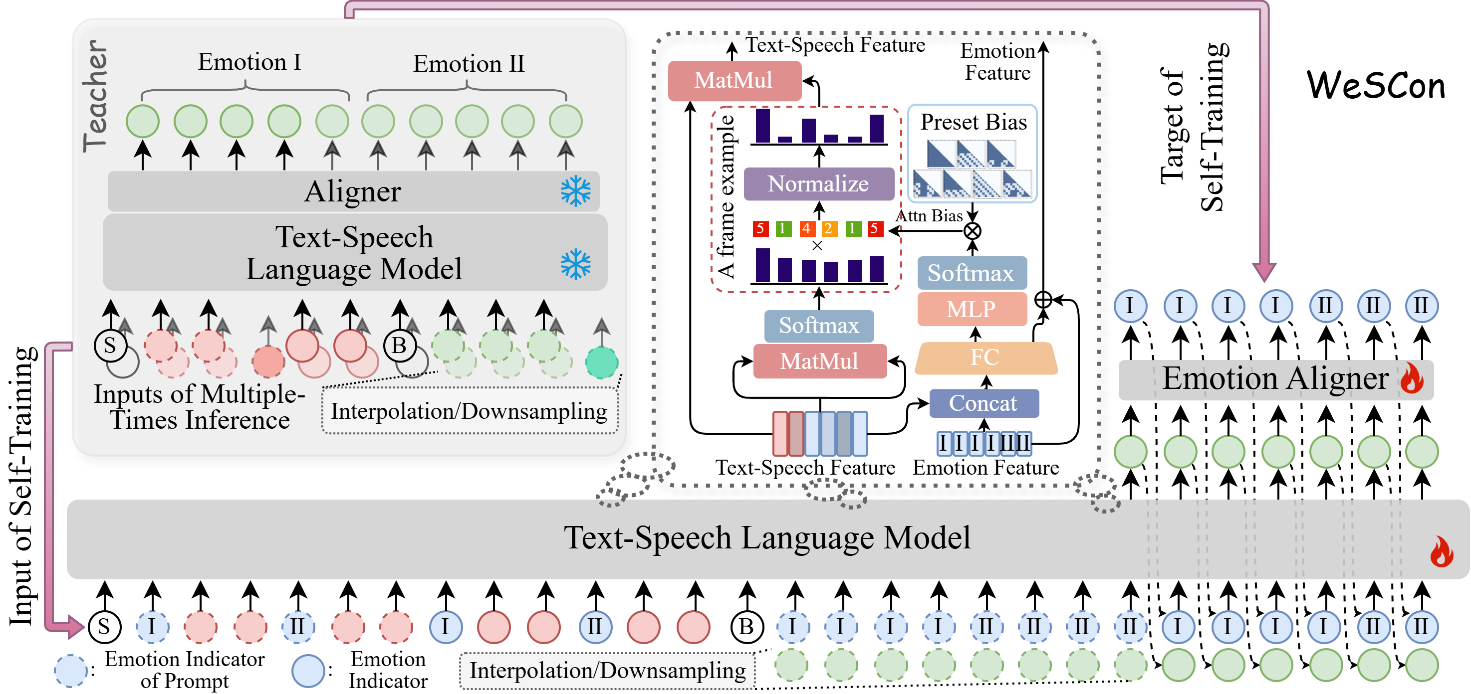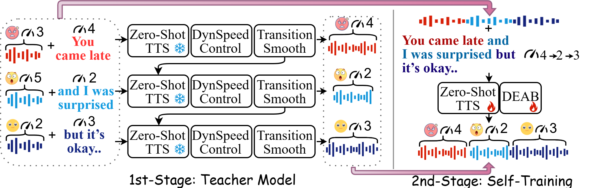 Figure 3. The proposed self-training strategy. A teacher model under a complex multi-round inference manner supervises a student TTS model to enable word-level emotion and speaking rate control. The dynamic emotional attention bias mechanism further enhances expressive generation in a simplified end-to-end single-pass inference manner.